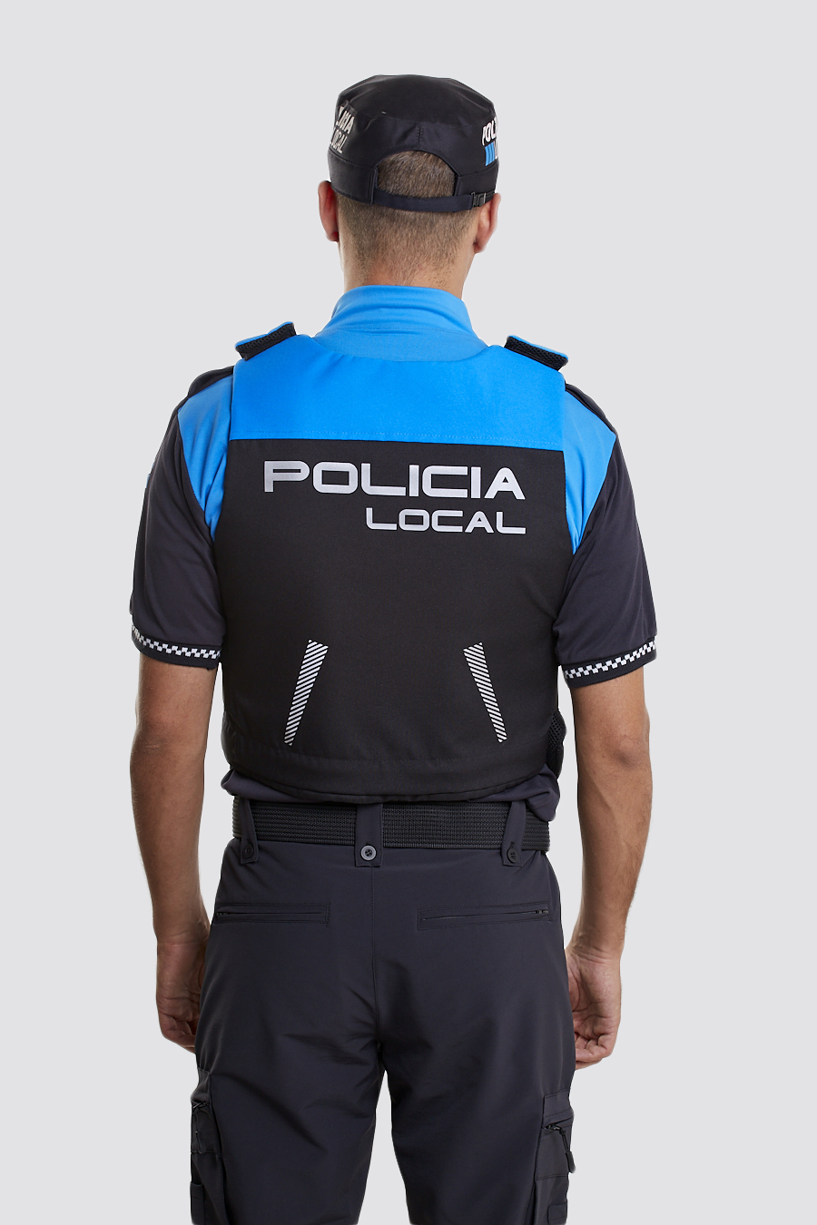 DELANTERO: Bicolor, corte de canesú, trabillas porta walki en hombros, Incluye dos puntos de ajuste mediante elásticos y velcro en cintura, con sobre tapa, con un bolsillo interior cerrado mediante cremallera y tapeta con un punto largo de velcro, en hombro 2 puntos de velcro para ajuste de altura para una perfecta colocación. Abertura inferior con cremallera para la colocación de panel balístico.