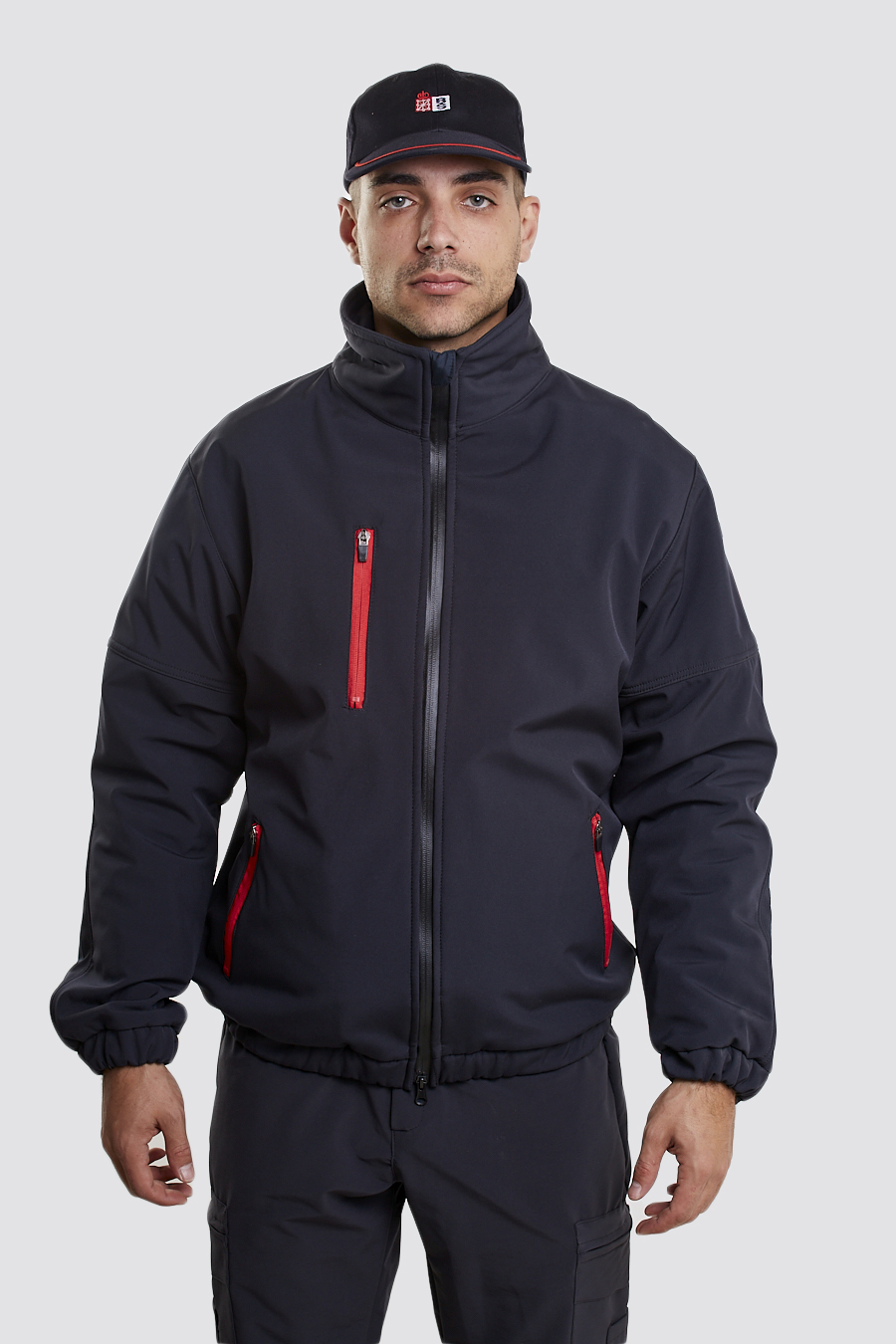 DELANTERO: Cerrado por cremallera vista en centro delantero. Bolsillo vertical en pecho izquierdo y en bajo bolsillos verticales ligeramente inclinados, cerrados por cremallera vista. Bajo de prenda, cinturilla con goma elástica.