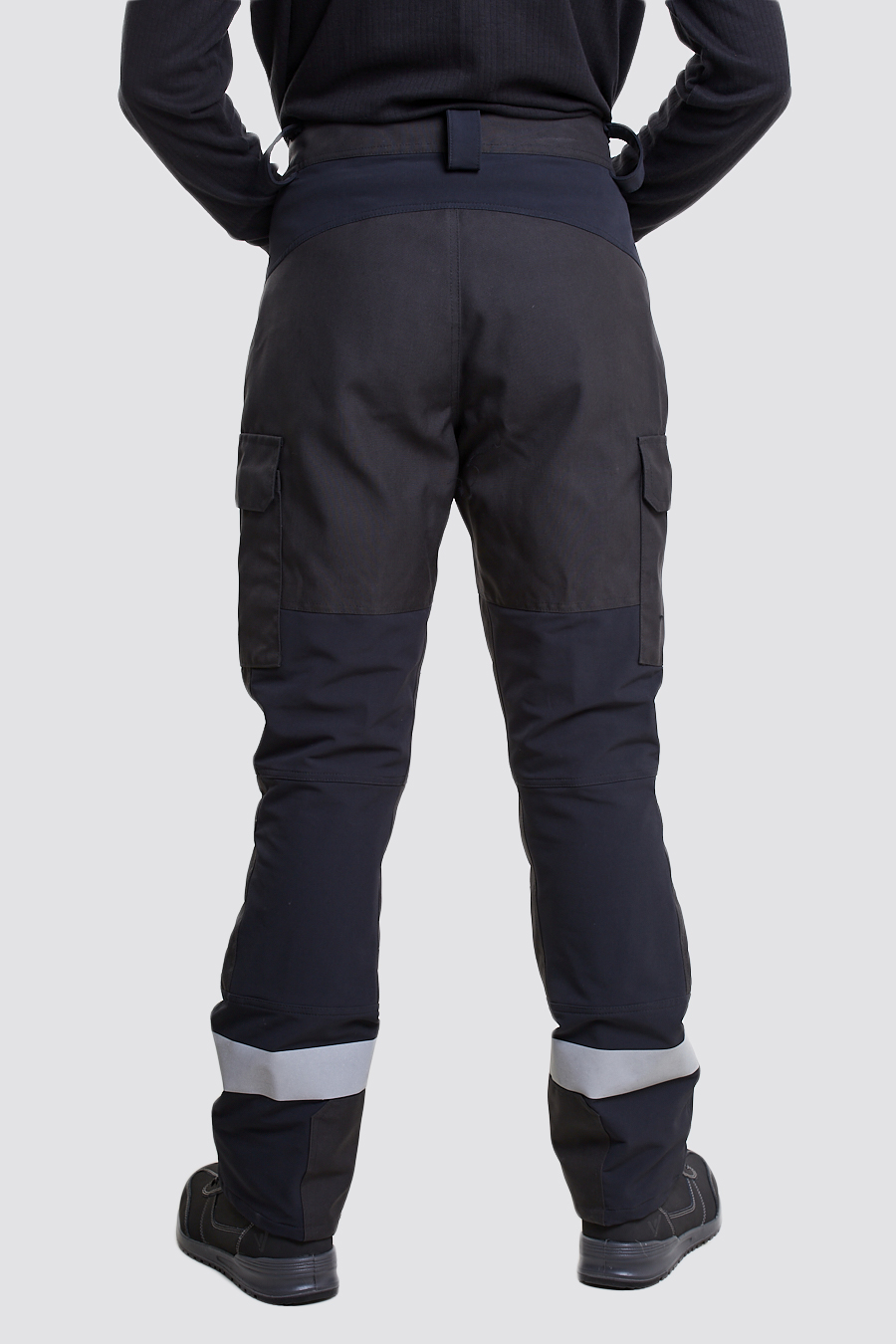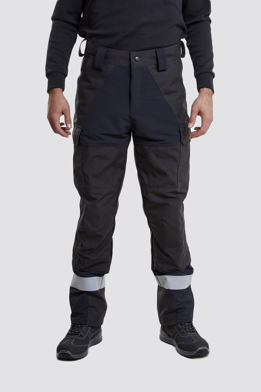 DELANTERO: Cierre central por cremallera protegida por tapeta. Bolsillo inclinado, bolsillo plastón lateral con cartera cerrado mediante velcro, rodilla preformada, cortes en delantero combinando tejido, para dar mayor comodidad a la prenda.