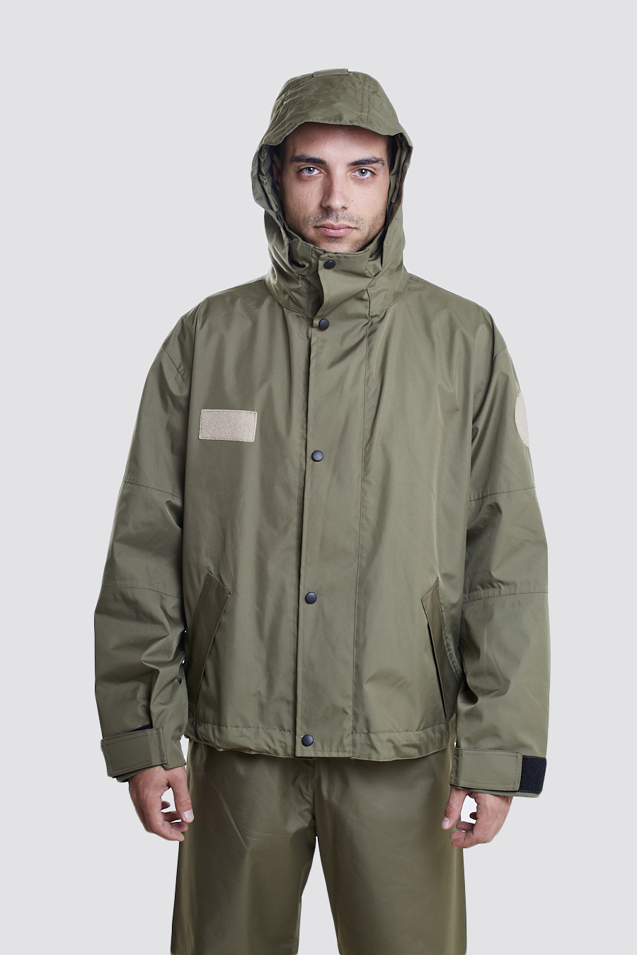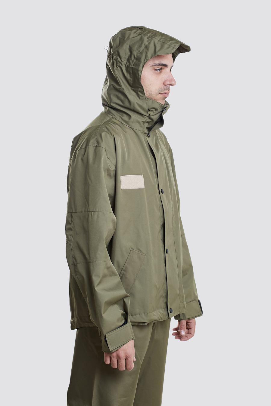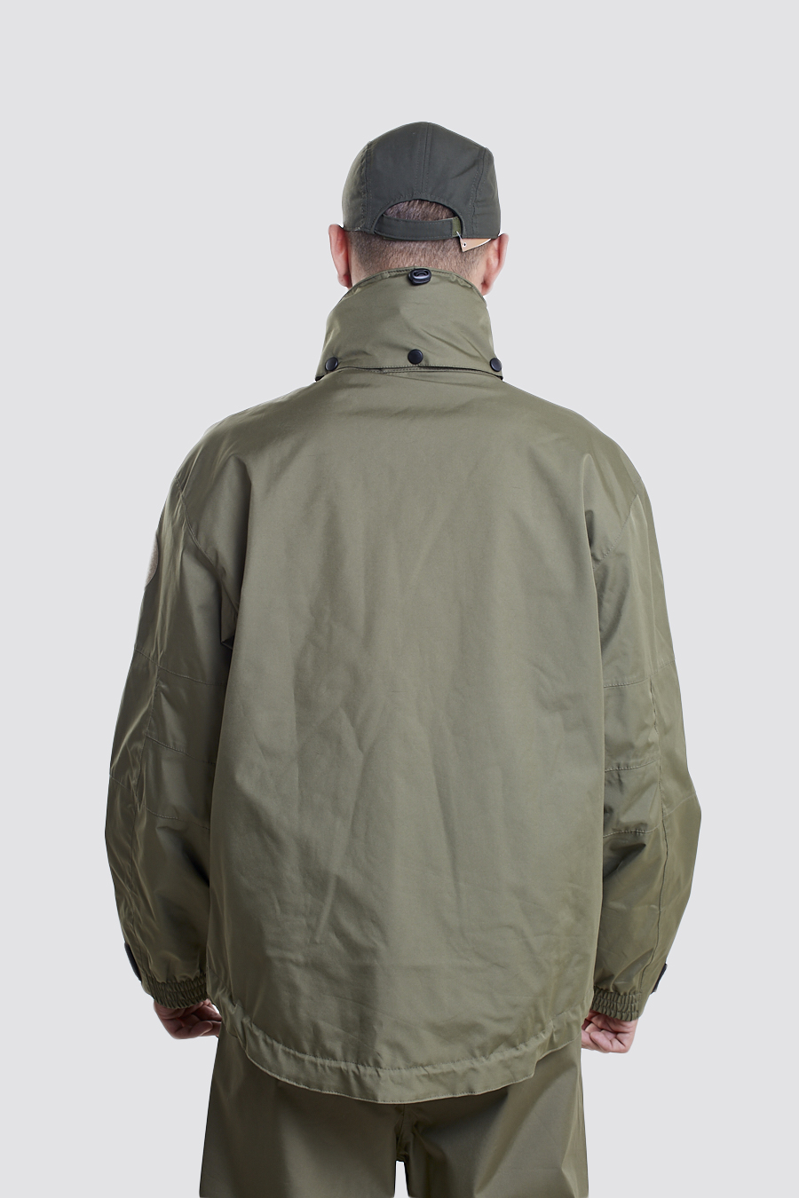 CUELLO: Alto, en la parte superior con ceñidor con goma ajustable y capucha escamoteable cerrada con tres broches de presión.